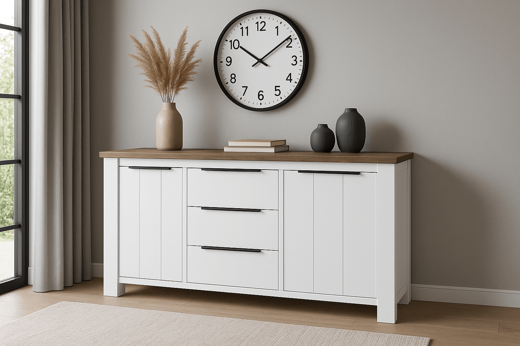 Maximize your dining or living space with our Buffet Cabinet featuring ample drawers and storage cabinets. This piece is thoughtfully designed to bring both style and practicality into your home, serving as a perfect blend of form and function. With 3 drawers and 2 spacious cabinets, this buffet offers plenty of room to store and organize your dining essentials, such as dinnerware, flatware, table linens, and more.