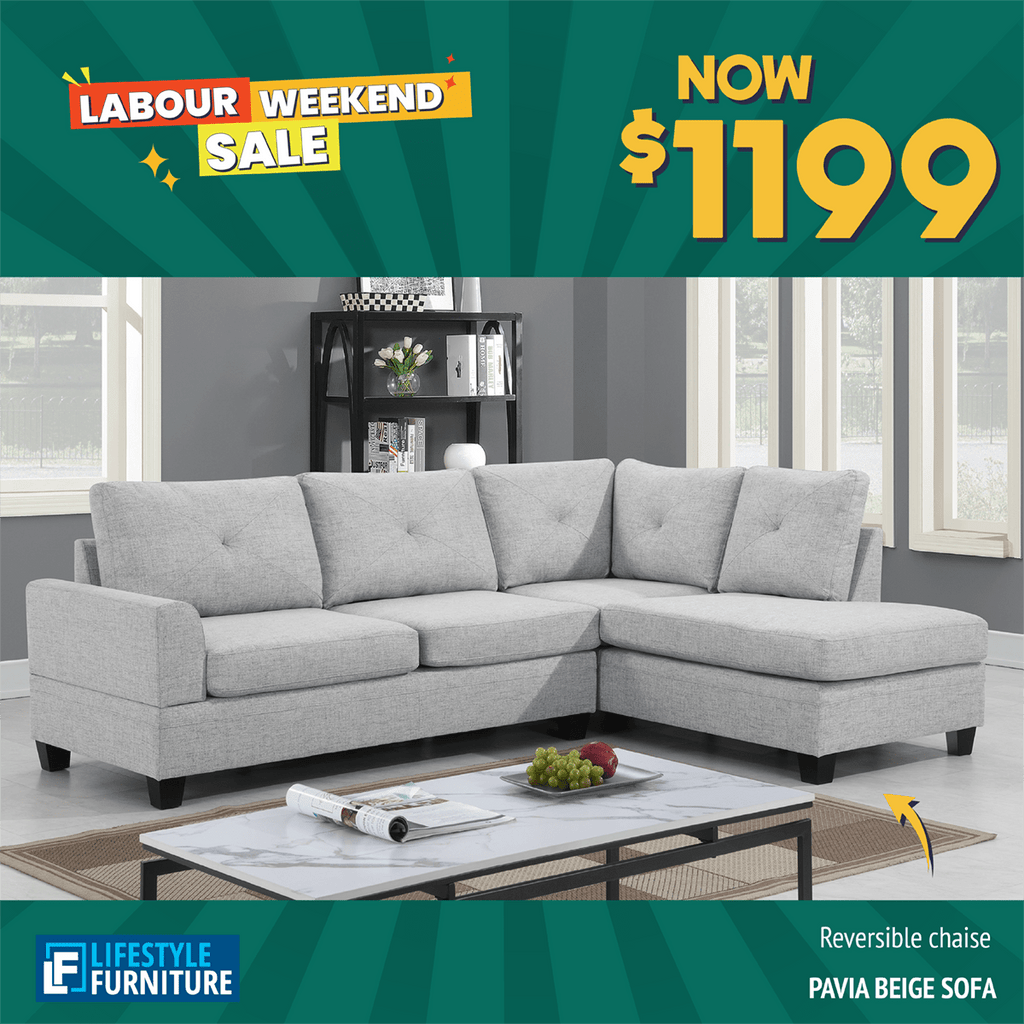 Buy the Pavia reversible sectional fabric corner sofa in one of our furniture stores or online. Furnish your home for less. This comfortable corner suite, which comes in a fully reversible neutral beige fabric, adds a touch of elegance and chic to your living room. The chaise can be conveniently positioned to the left or right to suit your space. Pavia Corner sofa reflects a comfort style that beautifully reflects simplicity, minimalism, and functionalism. Easy Assembly required and can be reversible