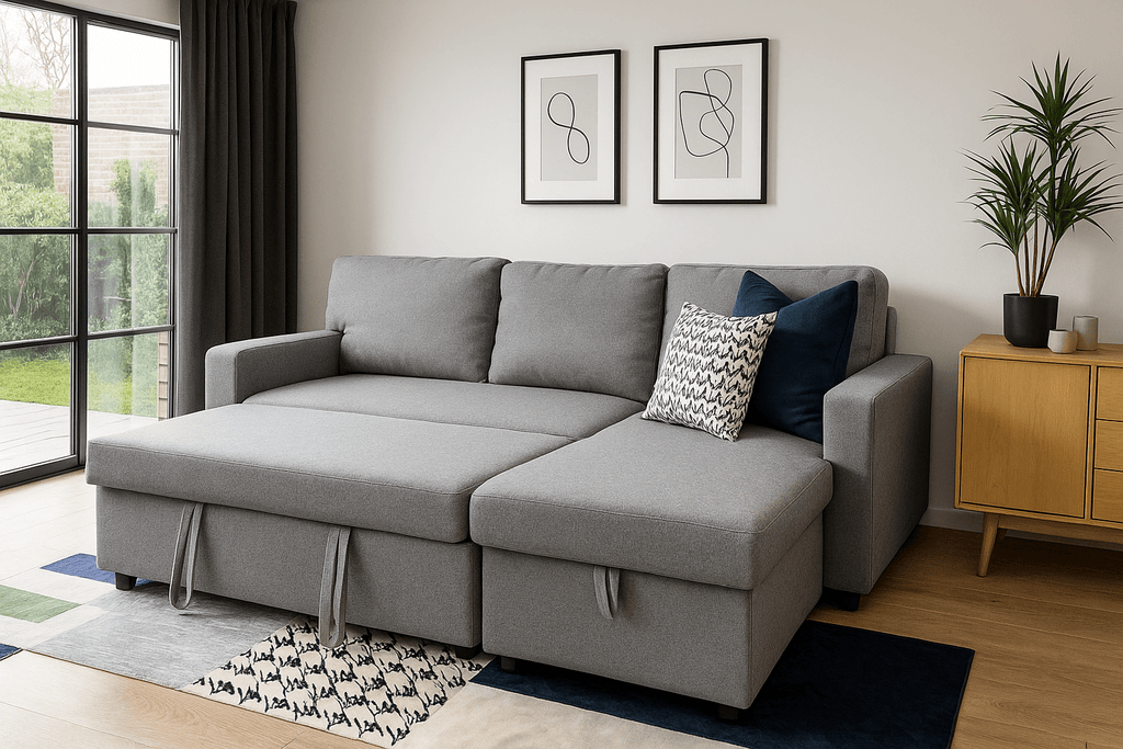 With a simple pull-out mechanism, it transforms easily into a comfortable bed, perfect for hosting overnight guests. The reversible chaise features hidden storage, providing a smart solution for keeping bedding, pillows, or living room essentials neatly tucked away.