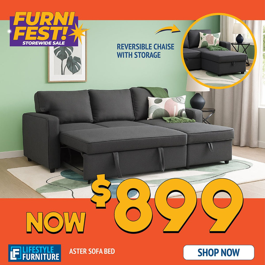 Buy the Aster sofa bed in-store in one of our furniture stores or online. Aster Pull out Sofa bed is a great addition to any living room. It comes with reversible chaise which provides you the convenience of selecting the orientation of the sofa bed. Aster also has a drop-down tray feature at the middle seat with two stainless steel cub holders. If you are enjoying a movie or a game with your drinks no worries, this sofa bed will hold the glasses or the bottles. This sofa bed is perfect for small apartments, guest rooms, or multifunctional spaces, this sofa bed effortlessly combines style, convenience, and comfort.